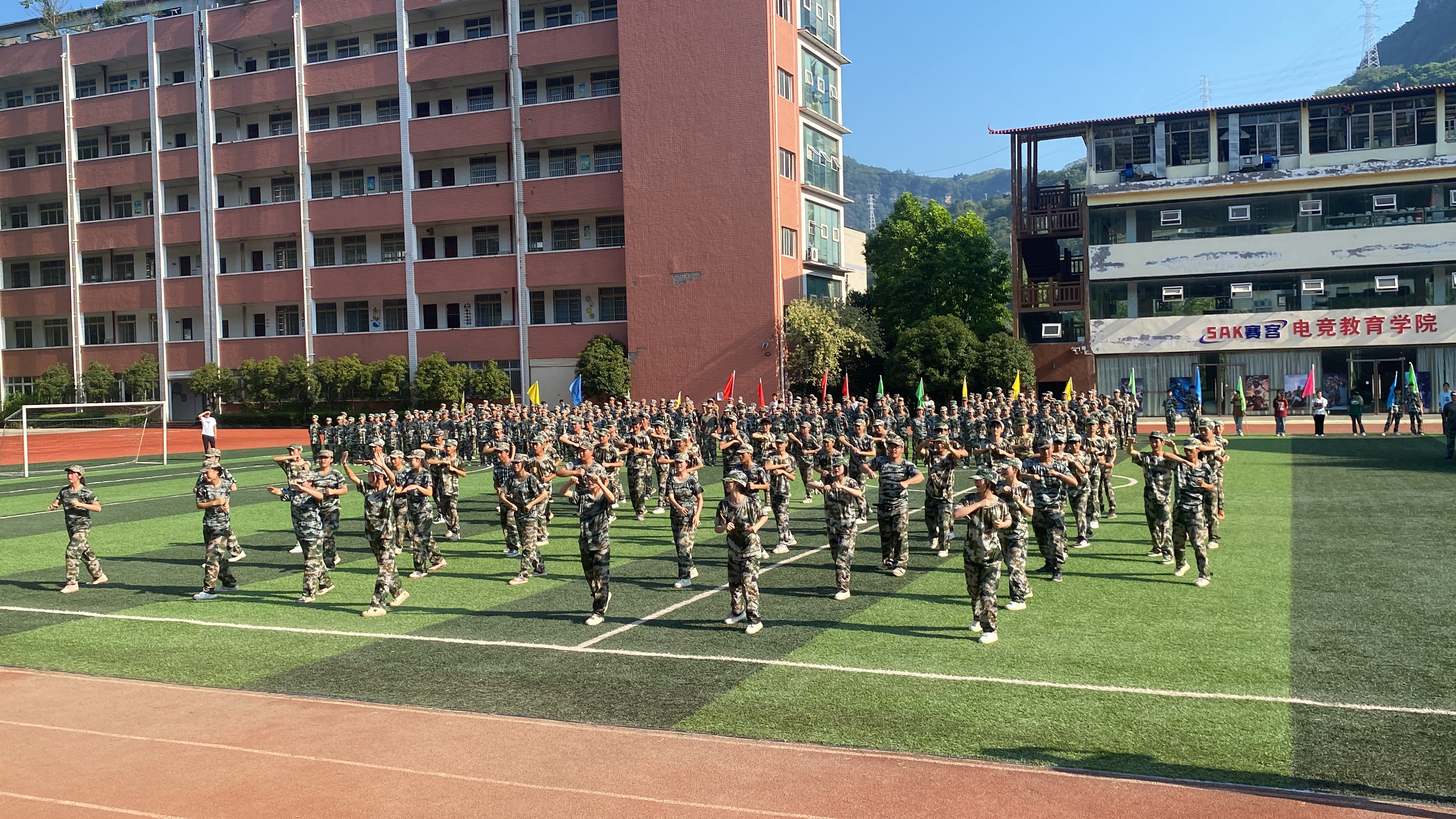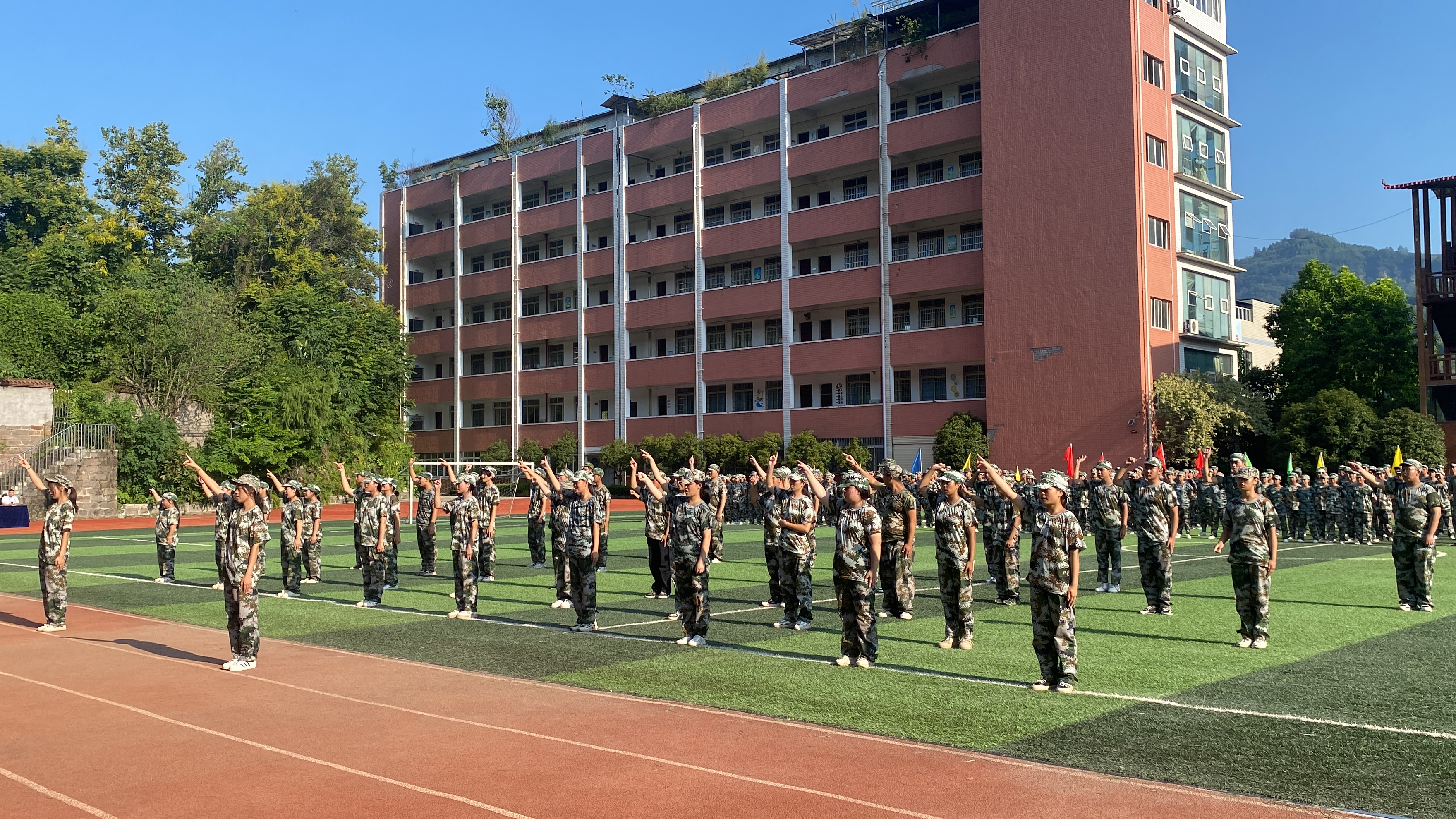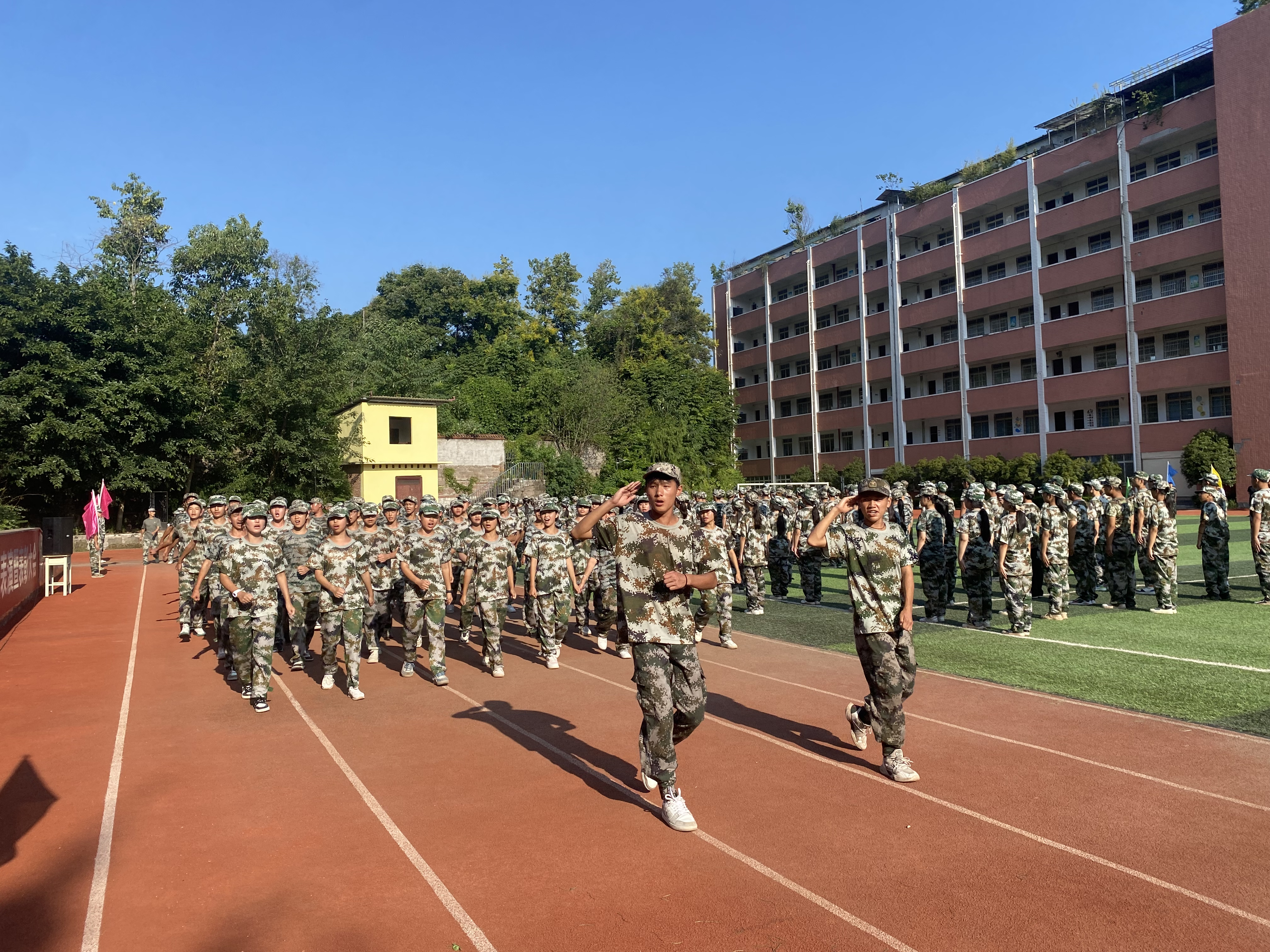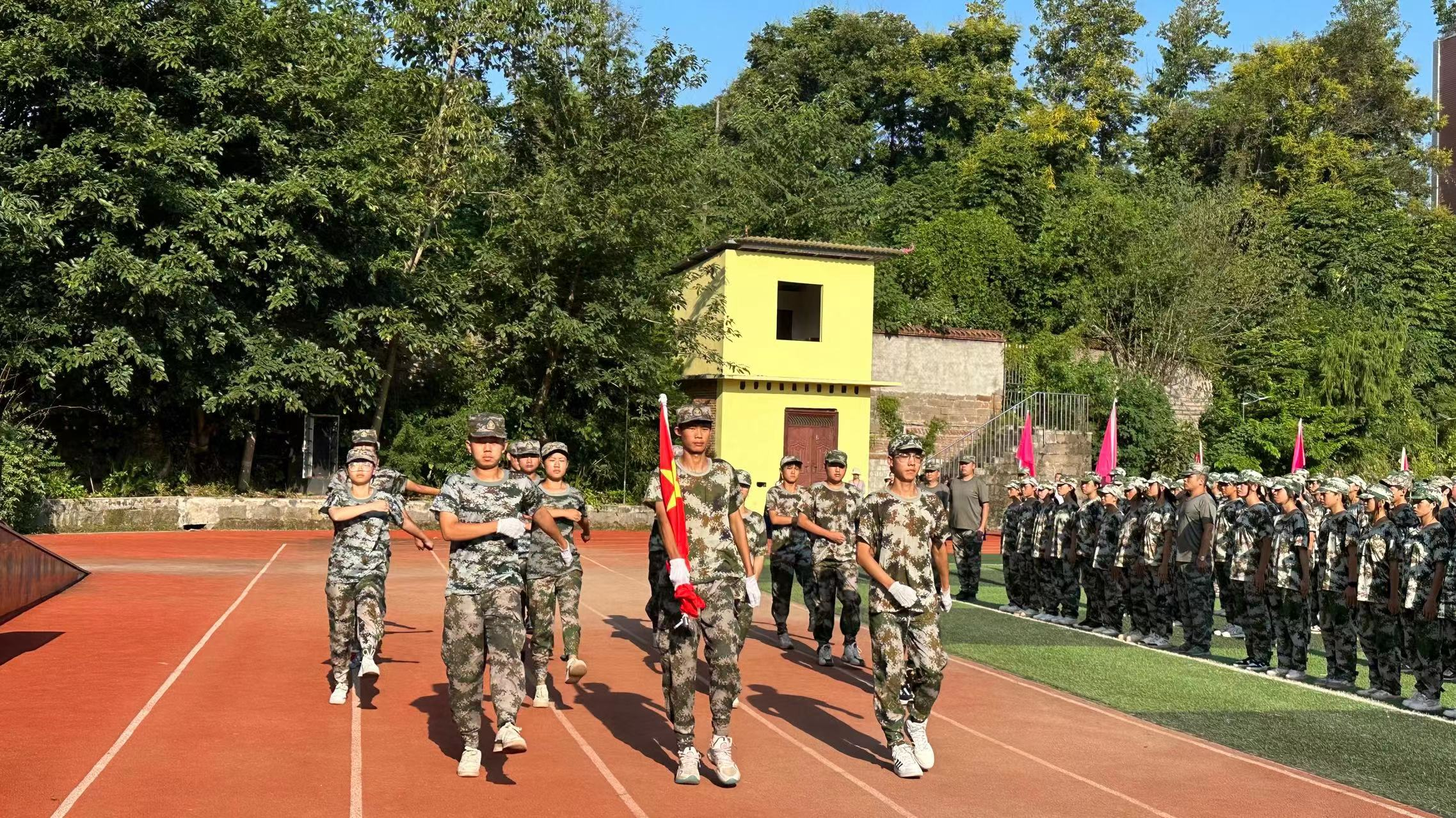 雄心因炼立显,壮志俞砺沸腾,为期八日的新生国防教育在全营全连昼练夜训的坚持中悄然而逝。2023年9月8日,学校迎来2023年秋季学期军训汇报表演、总结表彰大会暨热烈庆祝第39个教师节。党委书记向先政,校长张轶、军训负责人陈军等领导出席了本次仪式。闭营仪式在总教官的指挥下,气势如虹拉开序幕。 全场肃立,注目国旗护卫队托起鲜红的五星红旗徐升长空。在嘹亮的军乐进行曲中,全校6个连队迈着铿锵的步伐依序从主席台前踏过;“感恩的心”手语操方队扑面奔来,戴着白手套的纤细玉手指尖传语;阳光下张张青春笑脸,尽显巾帼不虚须眉之色,云聚风散的队列变化诉说着内心炽热的爱校情怀和祖国繁荣富强的美好愿景;踏着豪迈雄壮的音乐节奏,军体拳方队气势如虹,推击弹踢、上挑下切、疾步风行、拳出如锤。
