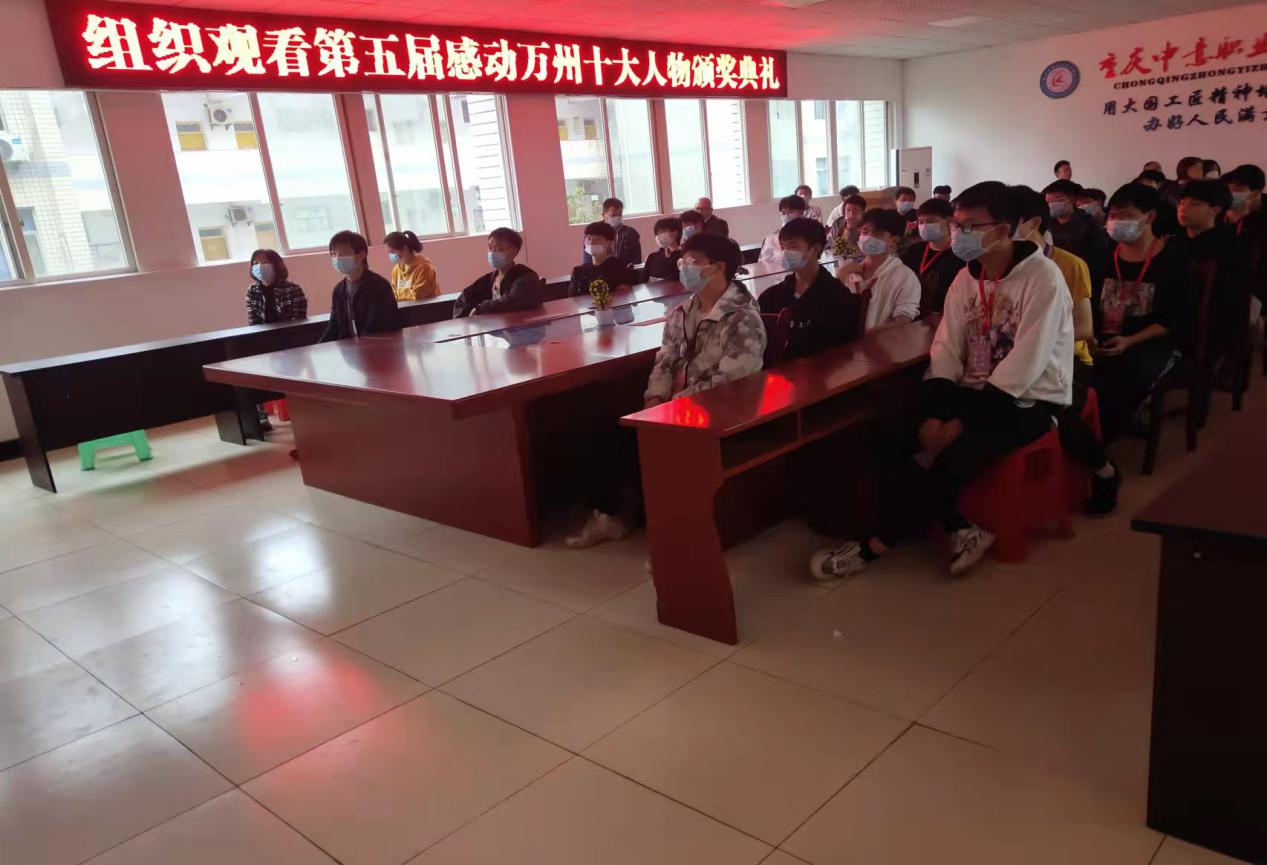 组织观看第五届感动万州十大人物颁奖典礼 为贯彻落实重庆市万州区教育委员会万州教宣函【2022】2号《关于组织收看第五届感动万州十大人物颁奖仪式的通知》文件精神,我校于2022年4月12日下午14:30组织部分学生及教师在二楼会议室收看了感动万州十大人物颁奖仪式视频直播。