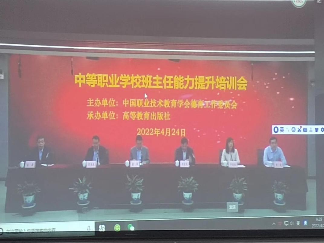 中等职业学校班主任能力培训会 为进一-步落实《国家中长期教育改革与发展规划纲要》、《国务院关于加快发展现代职业教育的决定》、《国家职业教育改革实施方案》,不断提升班主任队伍管理能力,加强师德师风建设,提高班级管理工作水平,提升班主任能力。我校于2022年4月24日,积极响应参加中国职业技术教育学会德育工作会和班主任能力提升培训会。